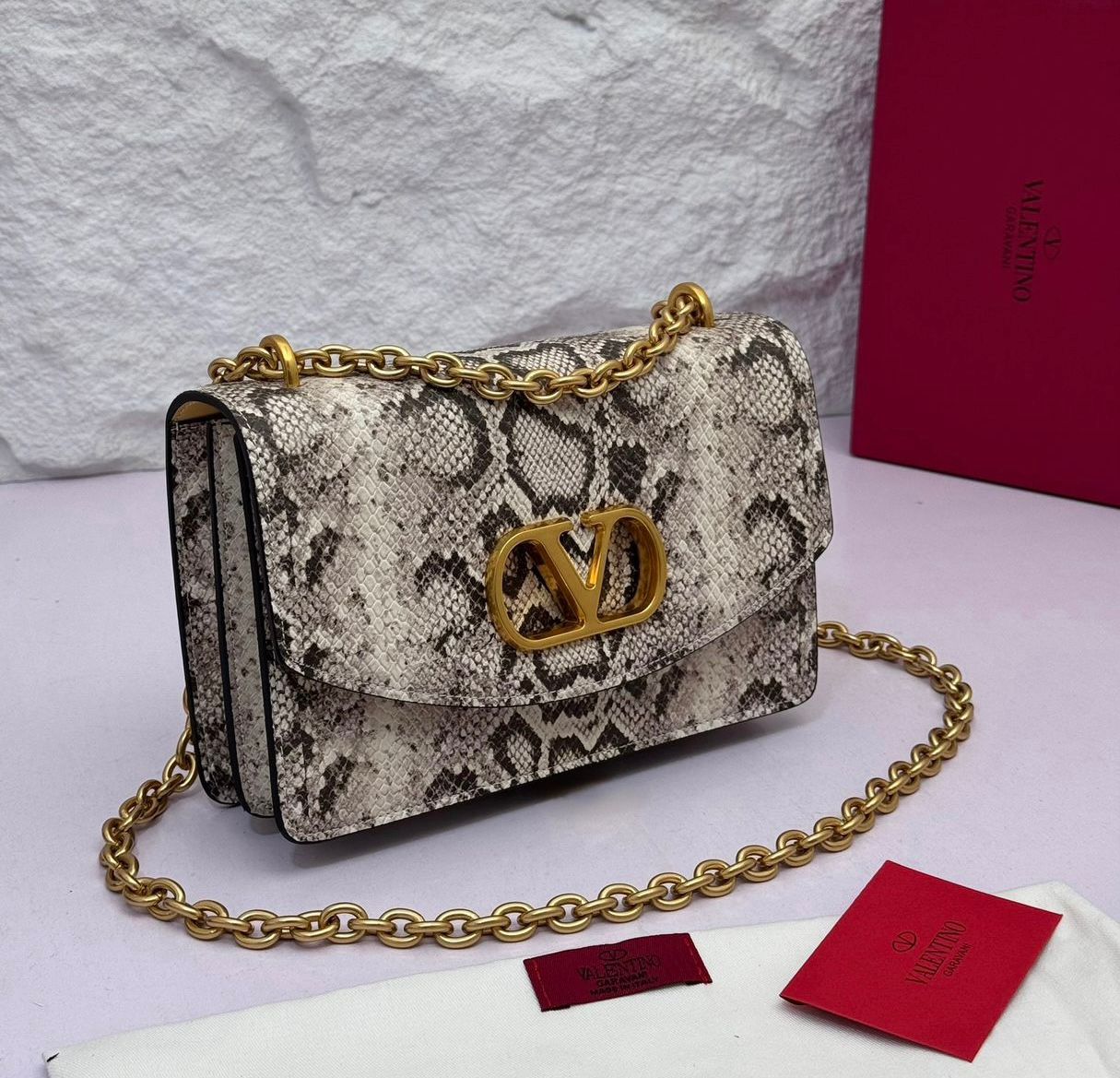 Turn heads with this Valentino-inspired snakeskin shoulder bag, featuring luxe python texture, bold gold V logo, and a glamorous chain strap.